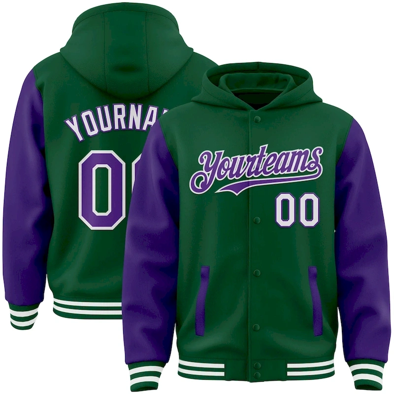 Custom Kelly Green Purple-White Bomber Full-Snap Varsity Letterman Two Tone Hoodie Jacket