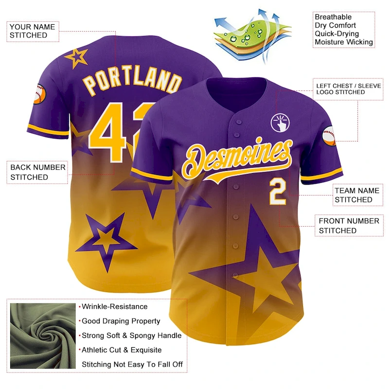 Custom Purple Gold-White 3D Pattern Design Gradient Style Twinkle Star Authentic Baseball Jersey